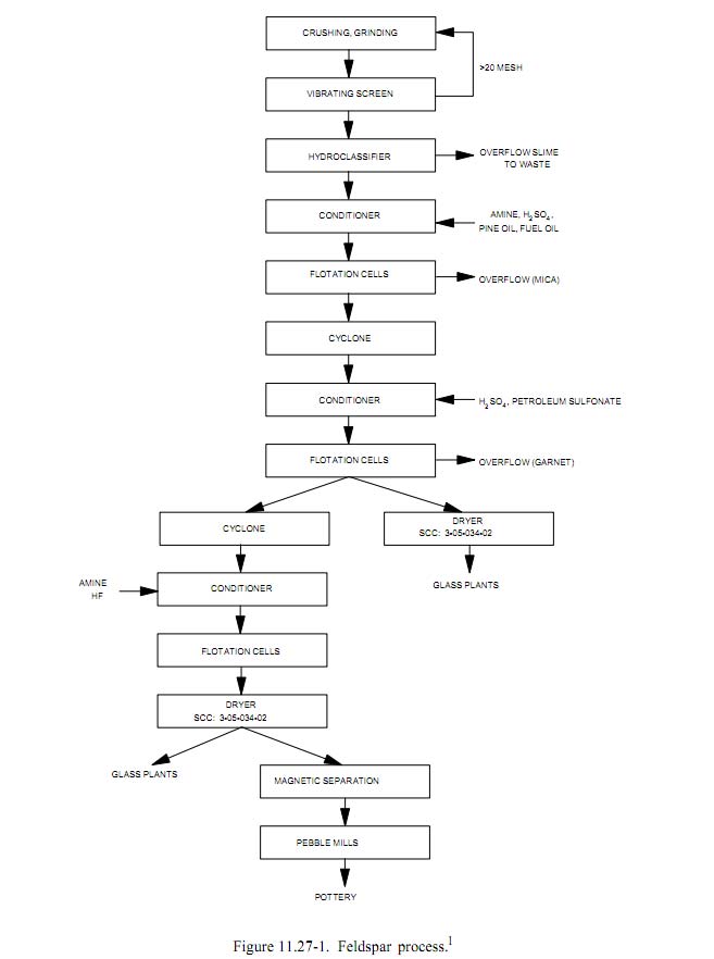 Conventional open-pit mining methods including removal of overburden, drilling and blasting, loading, and transport by trucks are used to mine ores containing feldspar. A froth flotation process is used for most feldspar ore beneficiation. The left image(click to see complete image) shows a process flow diagram of the flotation process. The ore is crushed by primary and secondary crushers and ground by jaw crushers, cone crushers, and ball mills until it is reduced to less than 841 µm (20 mesh). Then the ore passes to a three-stage, acid-circuit flotation process.