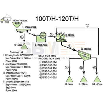 Esta planta de la trituración es especialmente diseñado por la producción de 100-120 tph. En esa planta de la trituración y zaranda. Optamos el alimentador vibratorio para alimentar la trituradora de mandíbula PE600*900 lo que cuenta con la capacidad máxima a 70-150 tph. Y el equipamiento secundario de la trituración es la trituradora de impacto PF1214 cuya capacidad puede ser 80-160 t/h. Para filitrar los materiales de diferentes tamaños, Zaranda vibratoria está jugando su papel.