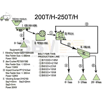 Esta línea de producción es un tipo de las plantas de trituración para las rocas grandes con la capacidad de 200-250 t / h. Las materias primas son alimentadas por el alimentador vibratorio, a la mandíbula trituradora de PE750 * 1060, cuya capacidad puede ser de hasta 130-260 t / h. Además, puede elegir nuestra trituradora de mandíbula PE900 × 1200, cuya capacidad puede ser de hasta 220-500 t / h. El equipo de trituración secundaria es la trituradora de impacto PF1315 que tenga una capacidad 160-260 t / h. PFV-1315 con la capacidad de 150-300 también puede ser utilizado como equipo secundario de trituración.La zaranda vibratoria también se utiliza para la detección de materiales con diferentes tamaños.