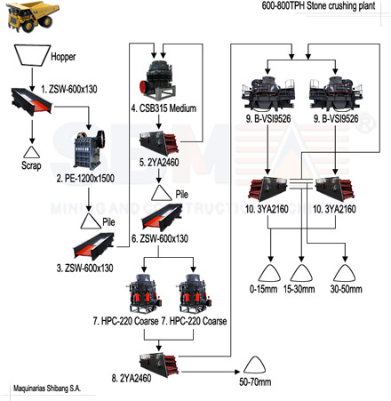 La planta de trituración de piedra de 600 TPH - 800 TPH consiste en la trituradora de mandíbula, trituradora de cono, trituradora VSI y otros equipos auxiliares.